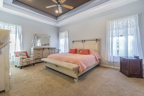 The primary suite exudes comfort and elegance, with two large walk-in closets, tray ceilings, and a barn door providing added privacy. The ensuite primary bath offers dual sinks, a garden tub, and a separate walk-in shower, creating a luxurious retreat for relaxation.