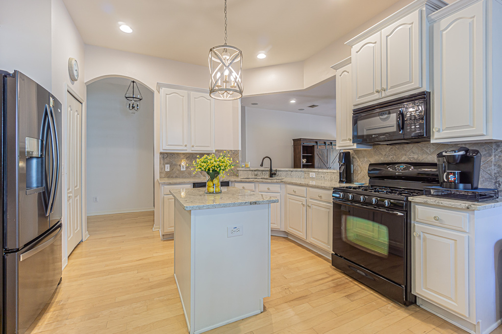 Upon entering, you'll be welcomed by an inviting open floor plan that seamlessly connects the main living areas. The kitchen is a chef's delight, featuring ample cabinetry, a breakfast bar, stone counters, a gas range, pendant lighting, tile backsplash, and a spacious pantry closet, perfect for entertaining.